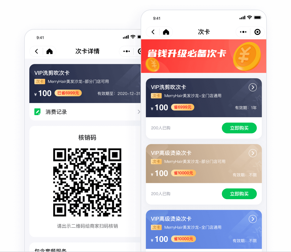 使用流程:会员购买次卡(或商户开卡) > 出示次卡核销码(或会员码) > 商户核销次卡套餐;