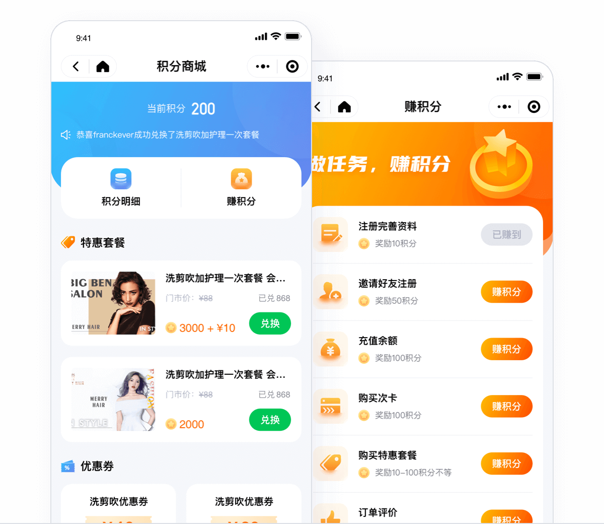 积分赚取:注册完善资料、邀请好友注册、充值余额、购买次卡、购买特惠套餐、订单评价;